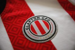 The Clapton CFC home kit – red-and-white stripes, black shorts, black socks – is a new twist on a classic, with a wide stripes and black trim. So far, so traditional.