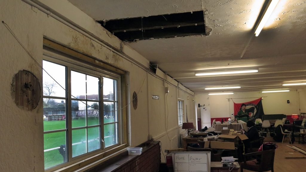 Before we took over the Old Spotted Dog Ground, a roof leak had caused part of the clubhouse ceiling to collapse.