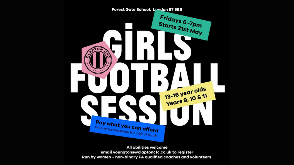 Clapton CFC is delighted to announce the expansion of its Young Tons programme in the form of a new coaching session for girls and non-binary young people of all abilities aged 13-16. The sessions will take place on Fridays, starting on the 21st of May 2021, at Forest Gate School, E7 on a ‘pay-what-you-can-afford’ basis.