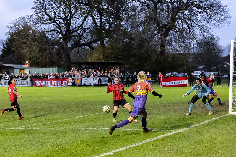 Clapton took a short corner. This gave Boiro a better angle to pick out a cross, to the back post and onto the head of an unmarked Ana Holmes. But the winger could not divert back across goal and glanced it just past the post.