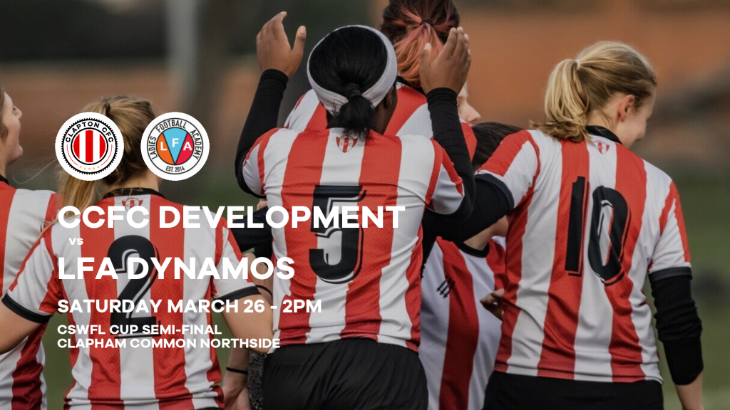 Clapton CFC Development vs LFA Dynamos is on Saturday, March 26 2022 at 2pm at Clapham Common Northside, London SW4 9DE.