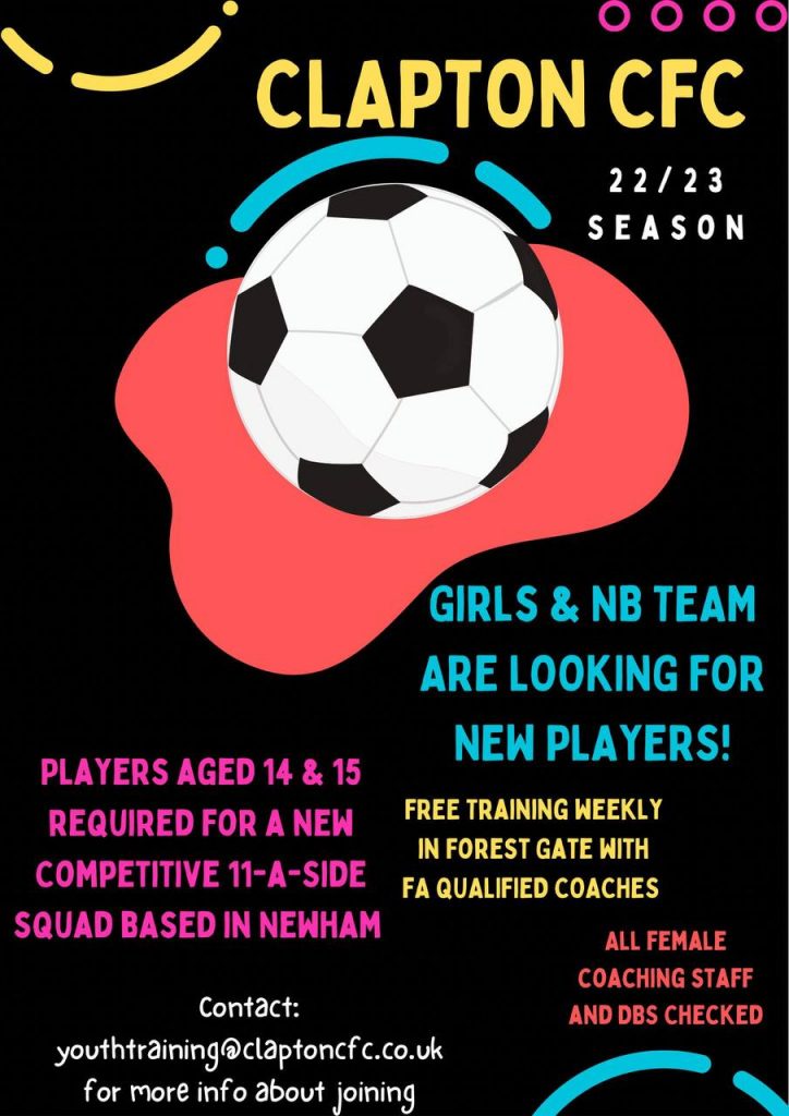 The Clapton CFC Girls & Non-Binary Squad are expanding! New players are wanted, aged 14-15.