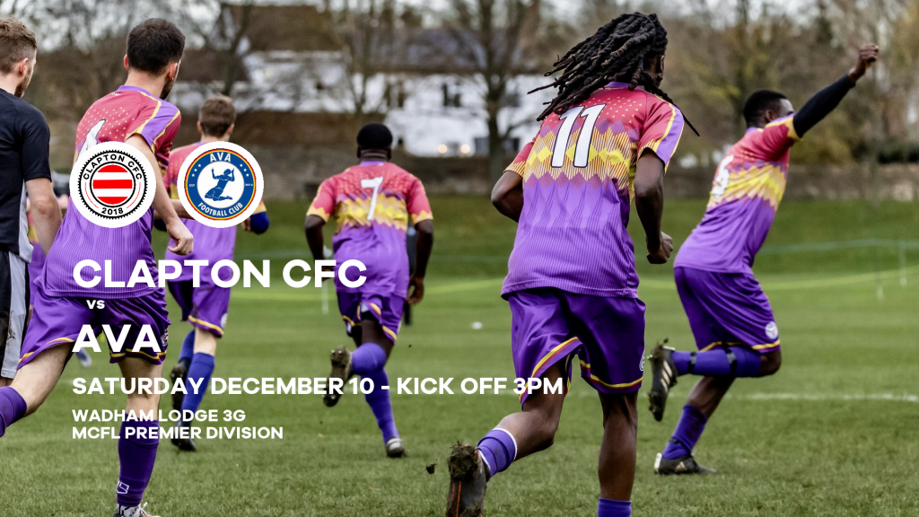 Clapton CFC vs AVA takes place on Saturday, December 10 2022 at 3pm, on the 3G pitch at Wadham Lodge Sports Ground, Kitchener Road, Walthamstow.