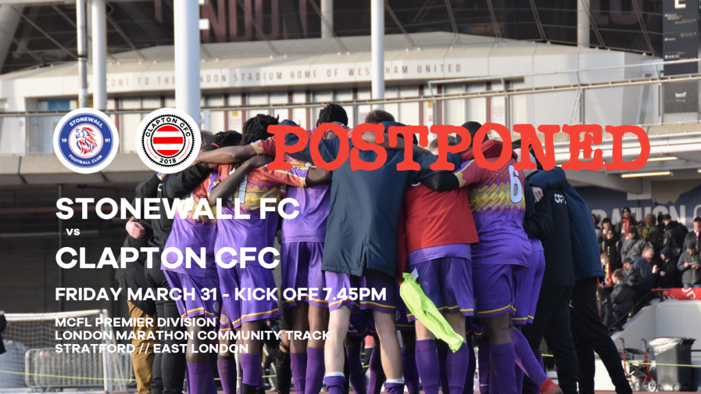 The Clapton CFC men’s first team’s visit to Stonewall FC for a Friday night East London derby has unfortunately been postponed due to a waterlogged pitch.