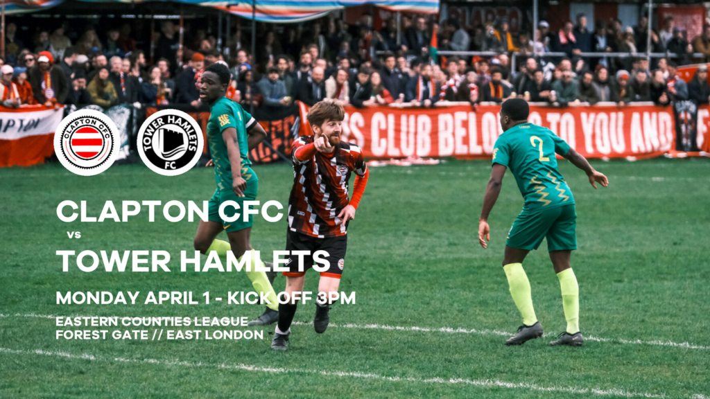Clapton Community FC vs Tower Hamlets takes place on Monday, April 1 2024 with a 3pm kick off at the Old Spotted Dog Ground, Forest Gate, East London.