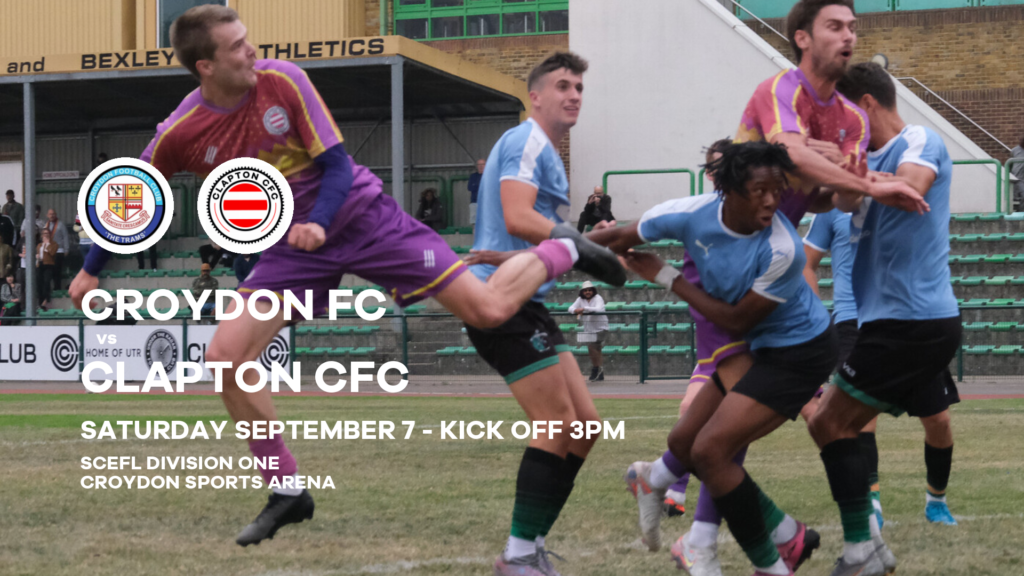 Croydon FC vs Clapton Community FC takes place on Saturday, September 7 2024 with a 3pm kick off at the Croydon Sports Arena, Albert Road, London SE25 4QL