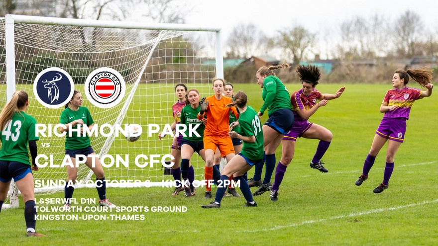 Richmond Park vs Clapton Community FC takes place on Sunday, October 5 2024 with a 2pm kick off at Tolworth Court Sports Ground, Old Kingston Road, Tolworth, KT4 7QH