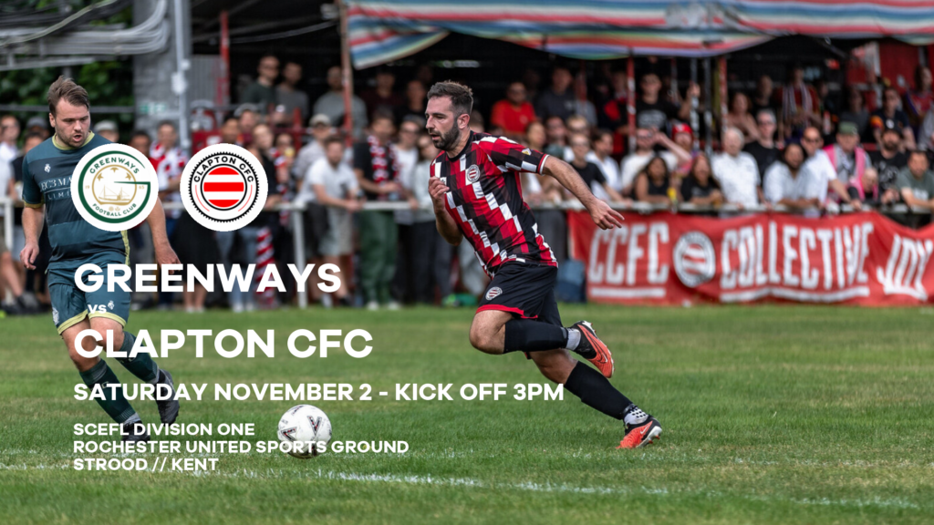 Greenways vs Clapton Community FC takes place on Saturday, November 2 2024 with a 3pm kick off at Rochester United Sports Ground, Rede Court Road, Strood, Kent, ME2 3TU