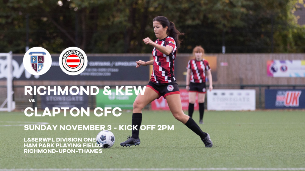 Richmond & Kew vs Clapton Community FC takes place on Sunday, November 3 2024 with a 2pm kick off at Ham Playing Fields, Riverside Drive, Richmond Upon Thames, TW10 7RX