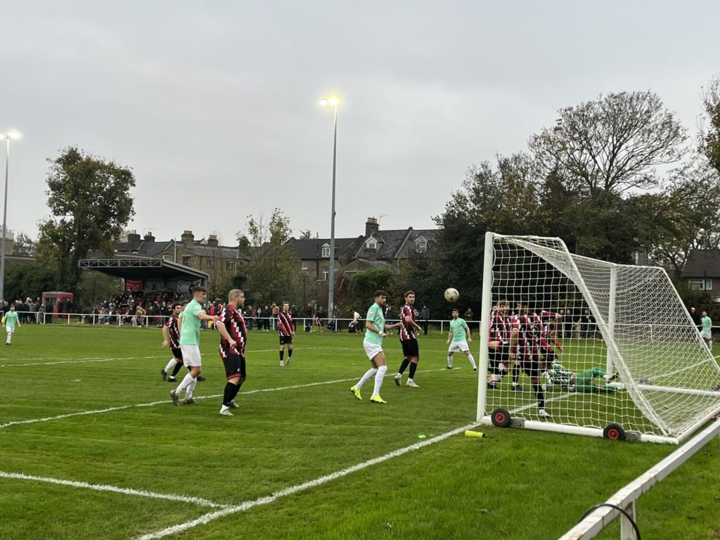 This was an encouraging passage for Clapton and it seemed like a goal was coming. Minutes later, Fred Taylor was wheeling away in celebration having slotted the ball past Ryan Dickerson, Thetford goalkeeper, after being played through by Julian Austin. Unfortunately, the referee disallowed the goal due to a rather harsh apparent handball in the buildup. News of the ruling took a couple of minutes to reach those under the scaffold, who could not hear the ref’s halting whistle over the raucous celebrations in the stands and were much confused as to why the ball had not been returned to the centre circle to restart the game.