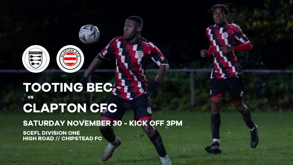 Tooting Bec vs Clapton Community FC takes place on Saturday, November 30 2024 with a 3pm kick off at Chipstead FC, High Road, Chipstead, CR5 3SF.