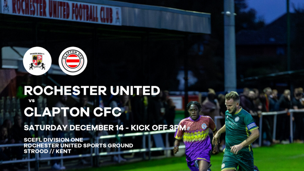 Rochester United vs Clapton Community FC takes place on Saturday, December 14 2024 with a 3pm kick off at Rochester United Sports Ground, Rede Court Road, Strood, Kent, ME2 3TU