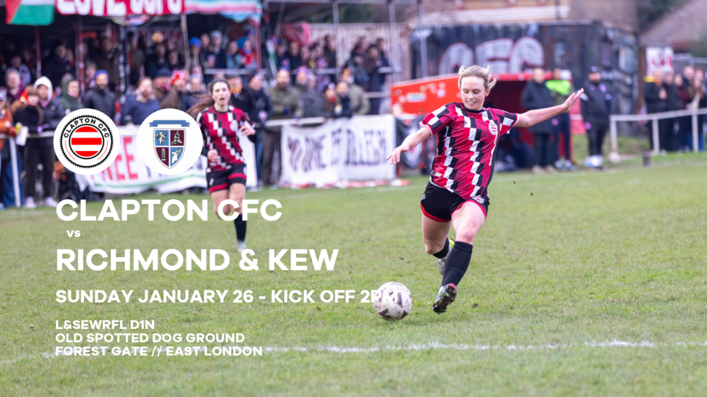 Clapton Community FC vs Richmond & Kew takes place on Sunday, January 26 2025 with a 2pm kick off at the Old Spotted Dog Ground, Forest Gate, East London.