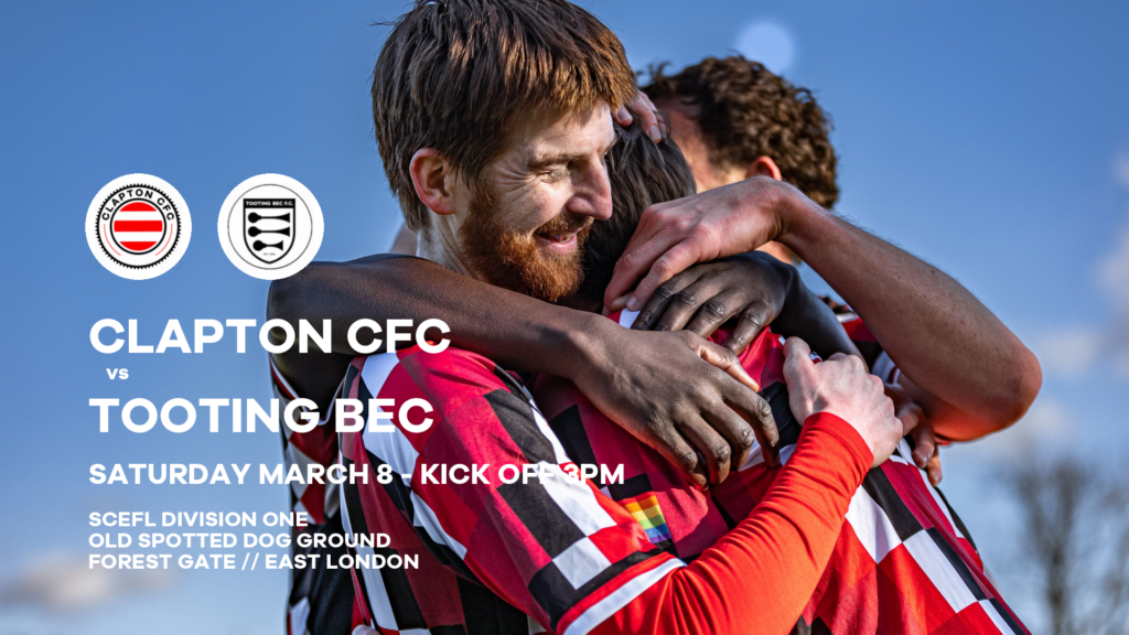 Clapton Community FC vs Tooting Bec takes place on Saturday, March 8 2025 with a 3pm kick off at the Old Spotted Dog Ground, 212 Upton Lane, Forest Gate, East London, E7 9NP.