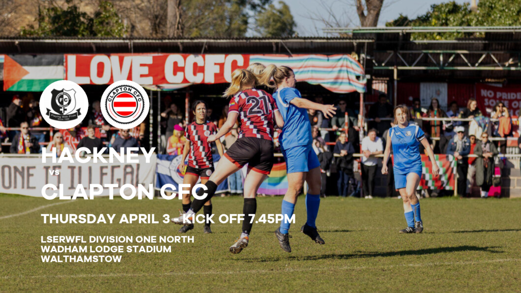 Hackney WFC vs Clapton Community FC takes place on Thursday, April 3 2025 with a 7.45pm kick off at the Wadham Lodge Stadium, Walthamstow, East London.
