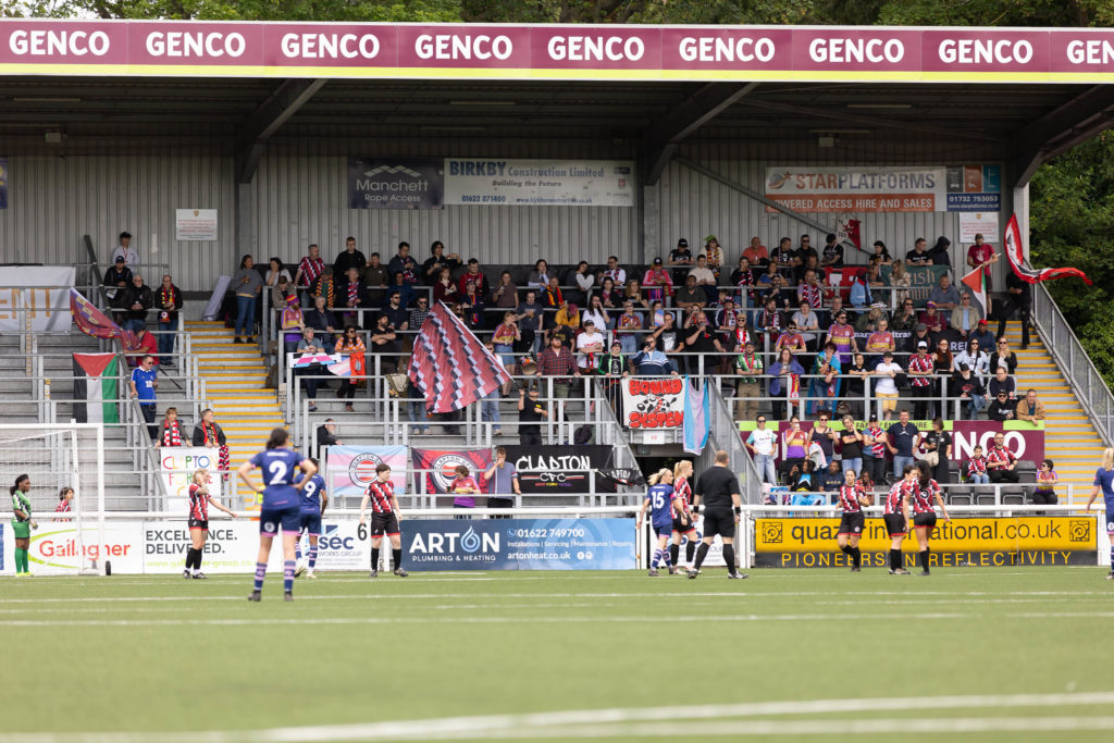The Women’s First Team game at Maidstone United on Sunday, May 25 was called off after around 20 minutes due to the presence of a Palestine flag among the Clapton support and an anti-genocide banner among the Dulwich support.