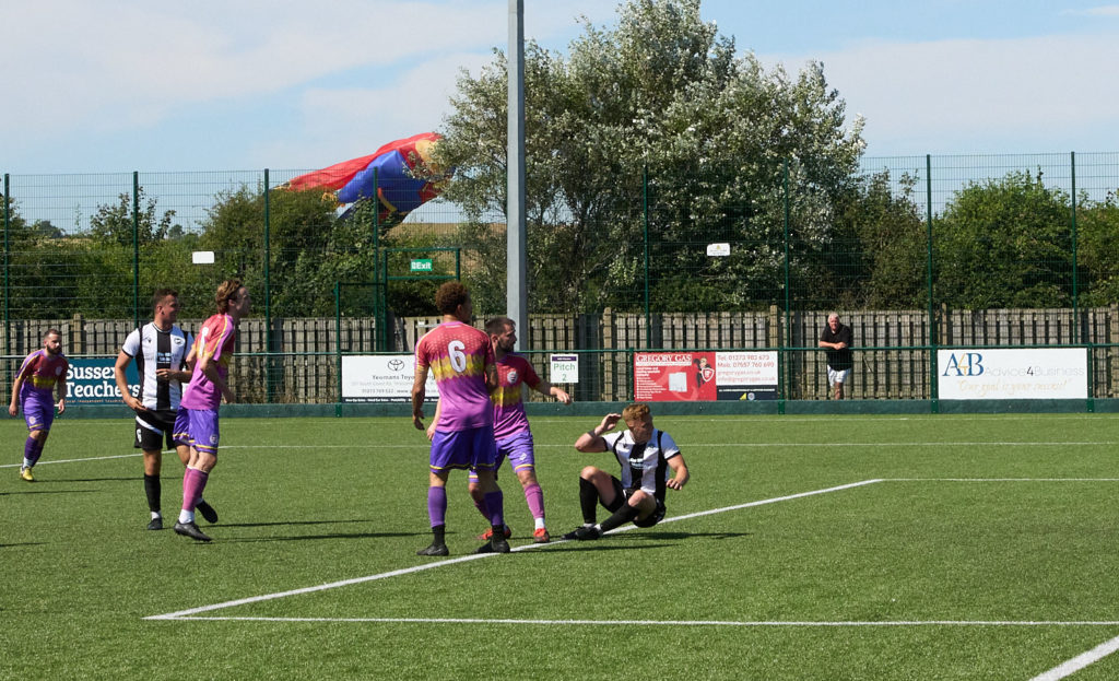 After a competitive first half, our higher division hosts eased to a 3-0 victory in front of a crowd of 210, and watched over by Superman and other kites from next door’s Peacehaven Fair.