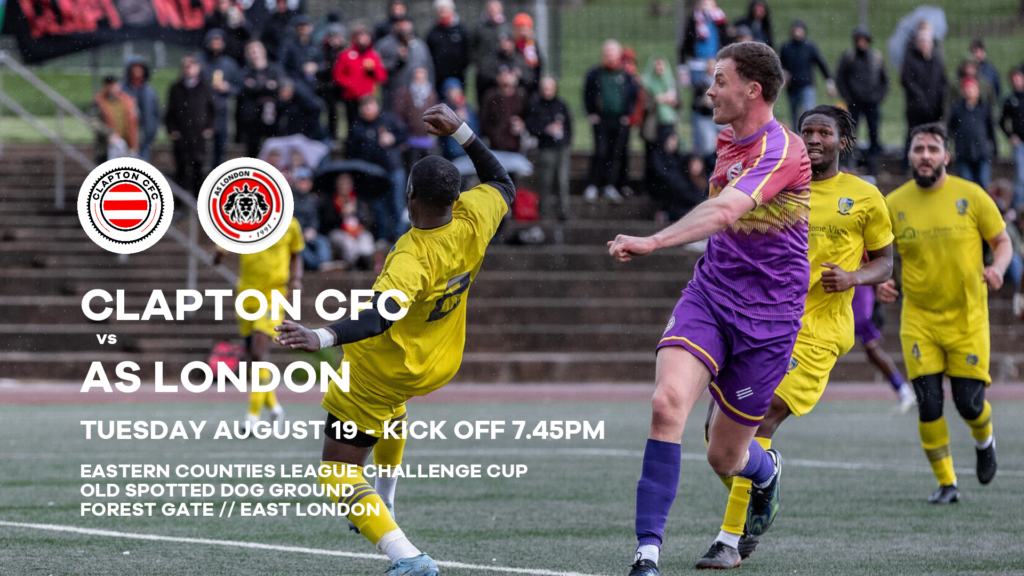 Clapton Community FC vs AS London takes place on Tuesday, August 19 2025 with a 7.45pm kick off at the Old Spotted Dog Ground, 212 Upton Lane, Forest Gate, East London, E7 9NP.