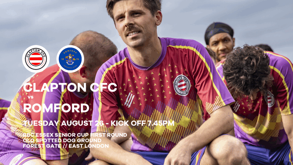 Anyway, back to the football in hand. Next up at the Old Spotted Dog Ground it’s a BBC Essex Senior Cup tie for the Clapton CFC Men’s First Team against Romford on Tuesday.